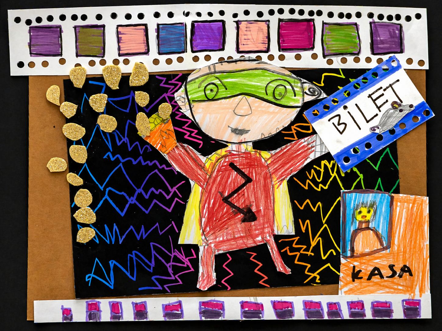 Policzyłem też nasze zapasy i mamy: 3 kolorowe słomki, 5 sreberek po czekoladzie (będzie na dekoracje) i 4 stare bilety kinowe (potnę je na konfetti).